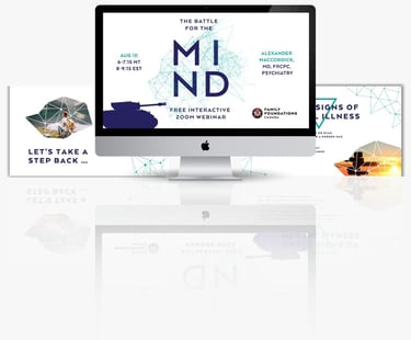 The Battle for The Mind is a webinar dealing with mental health. The main design is focused on an abstract look at neurons in the brain. I chose the colours to give it a medical feel. Assets included: a powerpoint, and fb graphics.