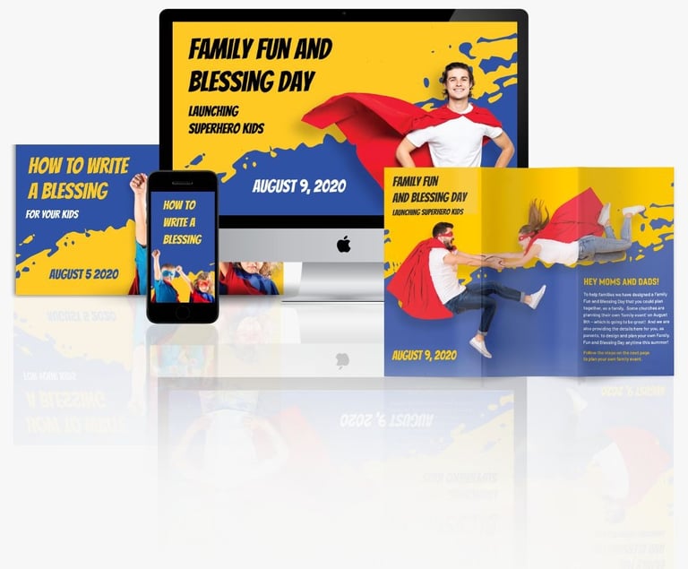 The Family Fun and Blessing Day is all about teaching parents the importance of blessing and the impact it has on their kids. The idea behind the design was using a comic book style font to emphasize the superhero feel. The paint stroke gives a childish feel. Assets included: web banners, web page, brochure, powerpoint, buck-slip, and fb graphics.