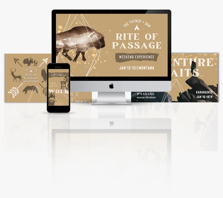 The Rite of Passage is where boys become men and dads become the fathers God has called them to be. the typography gives it a feeling of adventure, and the overall feel is a blend of modern and rustic. Assets included: a brochure, multiple video promos, fb graphics, instagram graphics, fb stories.