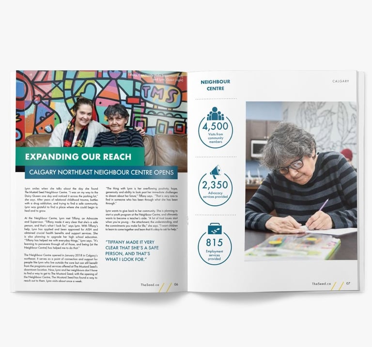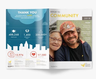 This is the cover to the Report to Community from 2019, it is basically an annual report to what happened at the mustard seed in the past year. The brand feel of TMS was that of modern and clean with a lot of infographics. The Colours used were from the brand colours.