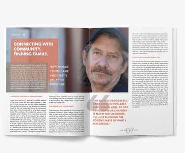 This is a spread from the 2019 Summer Newsletter at TMS, again the photo spans across the page to convey connectedness and reaching out. Colours were based on the mosaic centre sub brand of TMS.