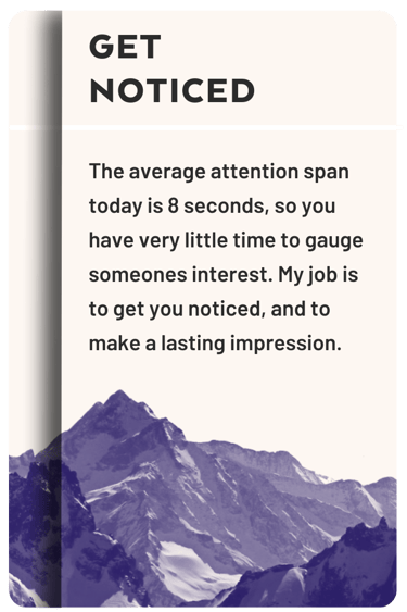 The average attention span today is 8 seconds, so you have very little time to gauge someones interest. My job is to get you noticed, and to make a lasting impression.